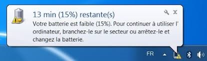 En utilisant son ordinateur portable,Mohamed a reçu un message lui précisant que sa batterie est faible et qu'il lui reste 15%. Après 13 min l'ordinateur s'éteint et ne redémarre plus.