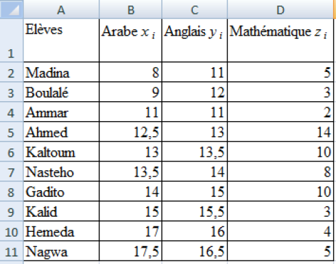 Les enseignants de mathématique, d'arabe et d'anglais d'une classe de terminale L souhaitent comparer les notes du bac blanc. Le tableau ci-dessous donne les résultats des notes sur 20 du bac blanc de 10 élèves choisi au hasard dans ces trois matières.