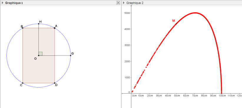 Dans le graphique 2, la trace du point M donne la représentation de l'aire du rectangle ABCD en fonction de la distance AB.