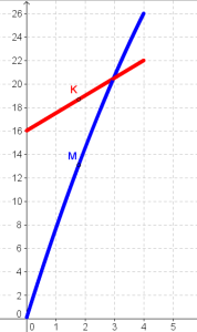 ABCD est un trapèze rectangle. Le point E est un point du segment [BC]. F est le point d'intersection de la droite (AD) avec la parallèle à (AB) passant par E. Dans le graphique ci-dessous, la trace du point M représente l'aire du trapèze ABEF en fonction de distance BE et la trace du point K représente le péri- mètre du trapèze ABEF en fonction de la distance BE. |