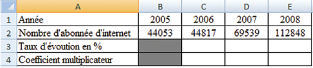 Quelle formule doit-on écrire dans la cellule C4 pour obtenir par recopie vers la droite les coefficients multiplicateurs?