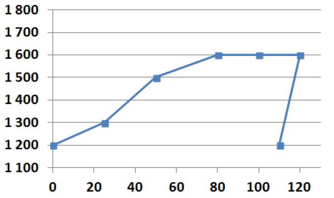 Dans le graphique ci-contre un randonneur décrit son parcours dans le mont Goda. Il représente l'altitude atteint (en m) en fonction du temps mis (en min). Il précise que son parcours commence du village de Birsiha et se termine au même point. Le tracé comporte une erreur vu qu'à la dernière étape, le temps mis est rétrogradé. |
