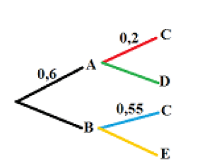 Dans l'arbre ci-contre, les probabilités pondérant les branches issues du nœud A sont des probabilités conditionnelles. On a donc et .