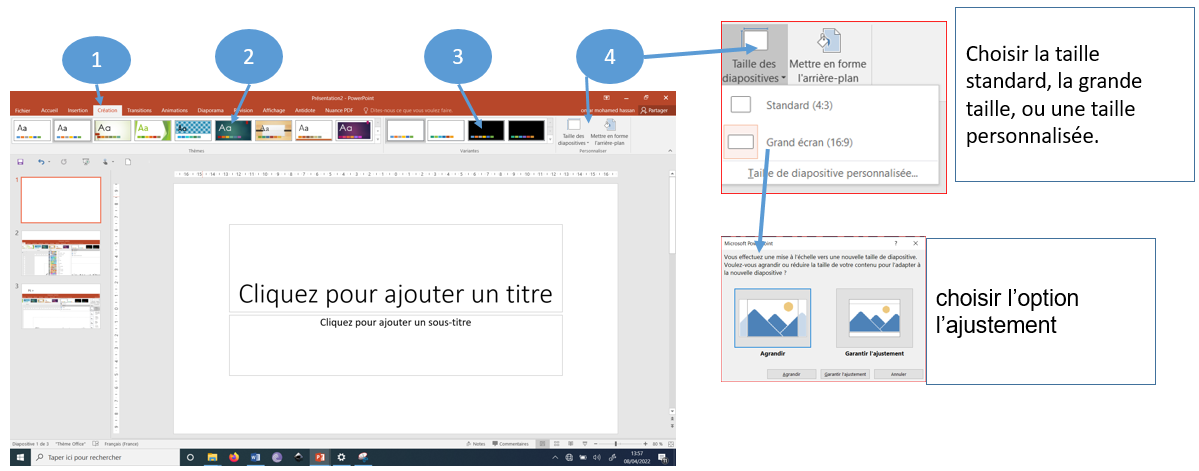 4. Changer la taille des diapositives et choisir l'option l'ajustement.