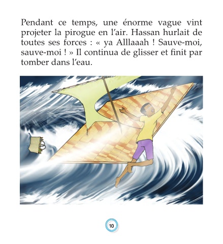 Pendant ce temps, une énorme vague vint projeter la pirogue en l’air. Hassan hurlait de toutes ses forces : « ya Alllaaah ! Sauve-moi, sauve-moi ! » Il continua de glisser et finit par tomber dans l’eau.