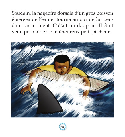 Soudain, la nageoire dorsale d’un gros poisson émergea de l’eau et tourna autour de lui pen- dant un moment. C’ était un dauphin. Il était venu pour aider le malheureux petit pêcheur.