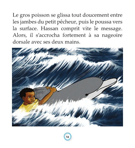 Le gros poisson se glissa tout doucement entre les jambes du petit pêcheur, puis le poussa vers la surface. Hassan comprit vite le message. Alors, il s’accrocha fortement à sa nageoire dorsale avec ses deux mains.