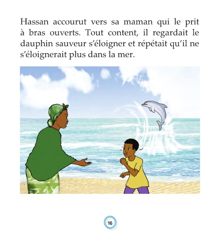 Hassan accourut vers sa maman qui le prit à bras ouverts. Tout content, il regardait le dauphin sauveur s’éloigner et répétait qu’il ne s’éloignerait plus dans la mer.