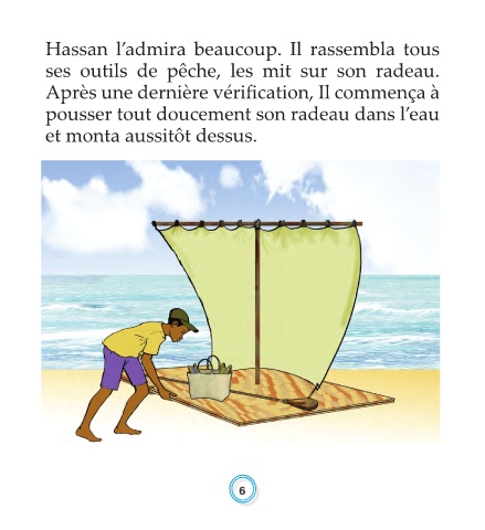 Hassan l’admira beaucoup. Il rassembla tous ses outils de pêche, les mit sur son radeau. Après une dernière vérification, Il commença à pousser tout doucement son radeau dans l’eau et monta aussitôt dessus.