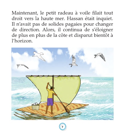Maintenant, le petit radeau à voile filait tout droit vers la haute mer. Hassan était inquiet. Il n’avait pas de solides pagaies pour changer de direction. Alors, il continua de s’éloigner de plus en plus de la côte et disparut bientôt à l’horizon.
