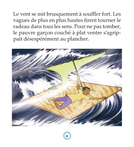 Le vent se mit brusquement à souffler fort. Les vagues de plus en plus hautes firent tourner le radeau dans tous les sens. Pour ne pas tomber, le pauvre garçon couché à plat ventre s’agrip- pait désespérément au plancher.
